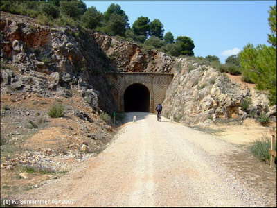 Der Tunnel von Reolid, bei Kilometer 87 des Radwegs, hat eine beachtliche Länge von 520 m und ist beleuchtet.