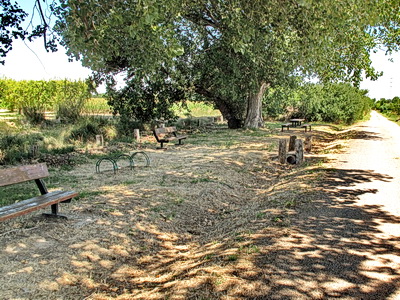 Die Rastplätze sind eher von diskretem Charme, aber der Schatten der riesigen Bäume ist willkommen in der Sommerhitze. An der Beschilderung gibt es nichts auszusetzen.