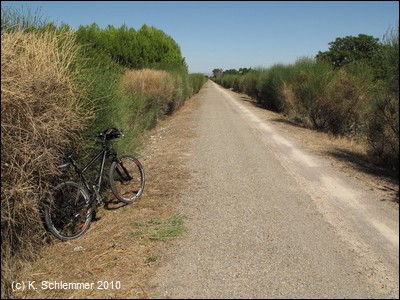 Die Benutzungsanleitung für die Vía Verde erinnert eher an deutsche Bürokratie: immerhin, Höchstgeschwindigkeit 20 kmh und nicht 10 kmh wie sonst üblich! Durch einen Schilfgürtel geht es stadtauswärts.
