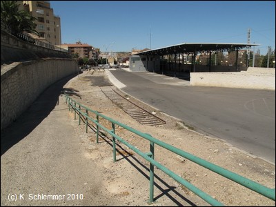 Einfahrt ins Bahnhofsgelände von Malón. Das Bahnhofsgebäude ist eine Ruine.