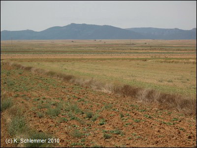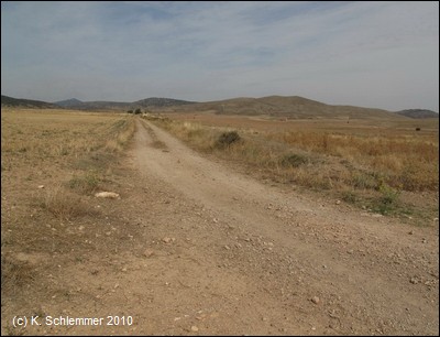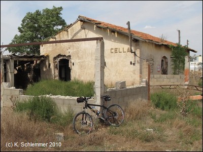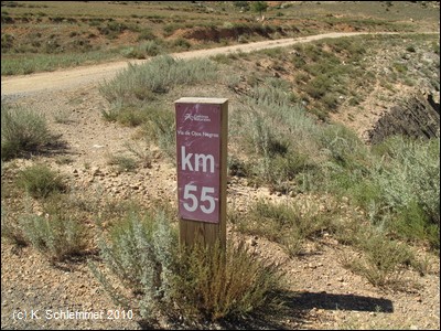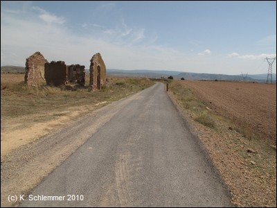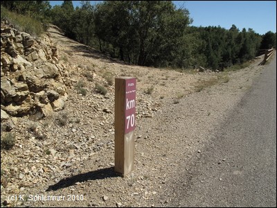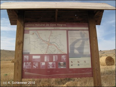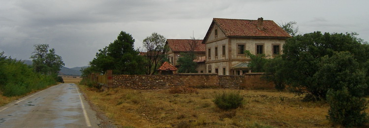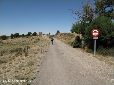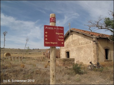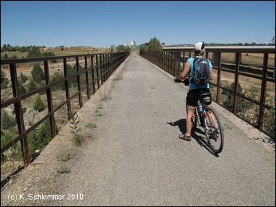 Rund 50 Kilometer trennen den Radler noch von den Eisenminen von Ojos Negros, rund 30 Kilometer sind auf der alten Bahntrasse noch ausgebaut. Das letzte Stück zum Beginn der Bahnstrecke muss man auf Nebenstraßen fahren, bis vielleicht irgendwann die Bahnstrecke noch ausgebaut wird. Nach der Hauptstadt Teruel führt die Trasse zuerst leicht bergauf, bei Cella erreicht man den Rio Jiloca, dem die Strecke weiter folgt. Es geht durch eine schier endlose weite Hochebene, die dem Radler einiges an Ausdauer auf diesem geraden und eintönigen Abschnitt abverlangt. Auch mit Widrigkeiten des Wetters muss gerechnet werden, es gibt in diesem Abschnitt kaum Unterschlupfmöglichkeiten. Heftiger Wind kann die Fahrtdauer erheblich verlängern! Die verlassenen Minen mit ihren verfallenden Gebäuden haben allerdings ihren eigenen Reiz. Die Gegend ist entvölkert, Projekte zur Verbesserung des Tourismus sind offensichlich in Planung. 2010 sahen wir die Schilder eines Unternehmens, das einige der alten Gebäude zu einer ländlichen Unterkunft ausbauen will. In diesem Jahr waren auch die Schienen bei Ojos Negros entfernt, die zuvor noch bis zu den alten Gebäuden führten. Vielleicht ist doch noch ein weiterer Radwegausbau geplant. Über der Hochebene bei Ojos Negros in Richtung Monreal del Campo steht noch eine alte Windmühle, die schön restauriert wurde und dafür sogar einen Preis erhielt. Von dort aus hat man einen herrlichen Blick über die Landschaft des Rio Jiloca. Ein weiterer markanter Punkt ist die Felsenburg Castillo de Peracense, wahrscheinlich aus dem 13. Jahrhundert.