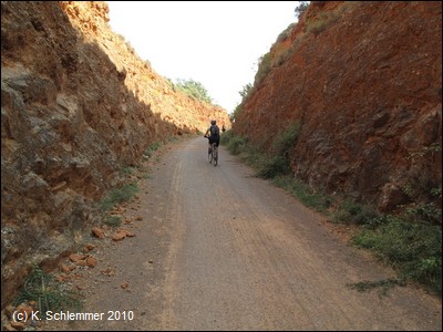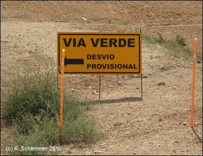 Auf der anderen Seite erreicht man wieder die alte Trasse. Hier beginnt der zuletzt ausgebaute Teil der Vía Verde. Noch sind wir 72 Kilometer von Ojos Negros entfernt.