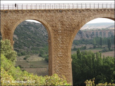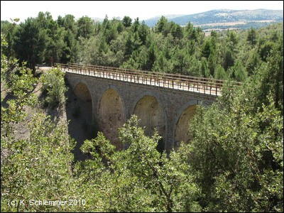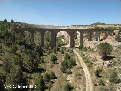 Das Viadukt von Albentosa, ein monumentales Bauwerk: 179,45 m lang, 50 m hoch. Im Hintergrund erkennt man das Viadukt der Parallelstrecke.