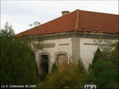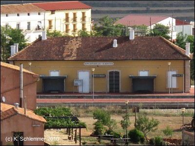 Der Bahnhof von Valdecebro taucht auf. Das Gebäude ist eine baufällige Ruine, Betreten verboten und gefährlich!