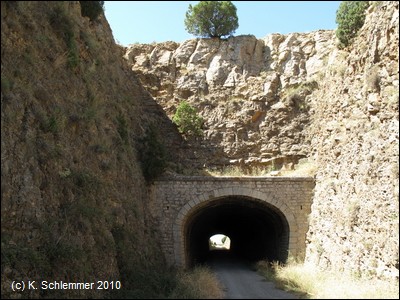 Der folgende Tunnel mit nur 92 m Länge braucht keine Beleuchtung. Plötzlich öffnet sich die Landschaft in die Ebene vor Teruel.