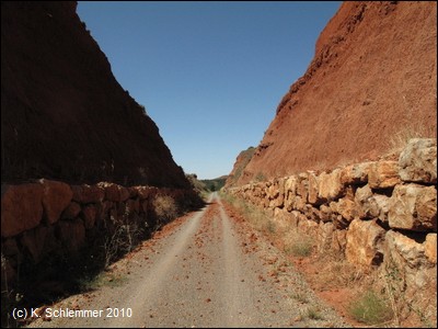 Und wieder tiefe, felsige Einschnitte in die Landschaft. Ein Rastplatz mit einem Brunnen und den originellen Fahrradständern am Wegesrand.