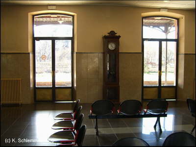 Der Bahnhof von Teruél, an dem die wenigen Züge der Strecke Valencia-Zaragoza ankommen, ist von einer Wohnzimmeratmosphäre mit Standuhr (Made in Germany!) geprägt. Der Fahrplan der „Regionales“ mit 3 Zügen nach Valencia und 3 Zügen nach Zaragoza pro Tag garantiert eine beschauliche Atmosphäre. Die Oberstadt ist vom Bahnhof aus mit einem Aufzug zu erreichen. Das Personal der RENFE war uns sehr behilflich bei der Organisation für unseren Fahrradtransport, der trotz der widrigen Umstände einwandfrei funktionierte (vielleicht hatten wir auch nur Glück).
