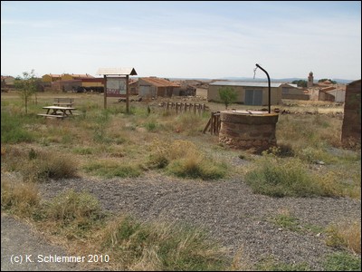 Der alte Brunnen existiert noch. Vorbei an den alten Ruinen geht es durch die staubige Ebene.