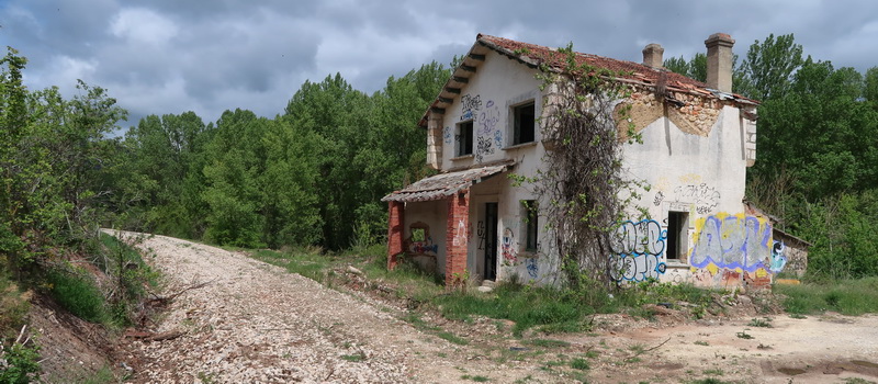 Bahnhof Peñahorada, einst ein stattliches Gebäude, heute nur noch ein baufälliges Skelett, ebenso wie die Nebengebäude. Noch lange zieht sich der Bahnsteig an der Trasse entlang.