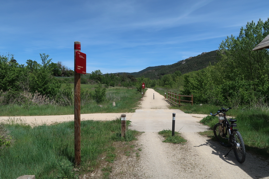 Nach dem Bahnhof geht der Radweg in einen schmalen Pfad über. Deshalb führt eine kurze Umfahrung gleich hinter dem Gebäude rechts ab und durch den Ort. Dort kann man die Nationalstraße N-623 überqueren. Am nördlichen Ortsende trifft man wieder auf die ausgebaute Strecke.