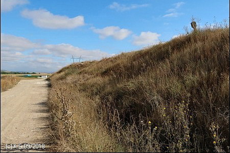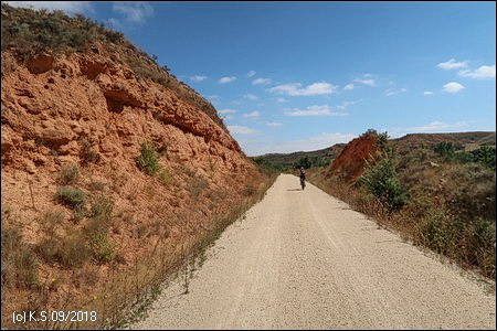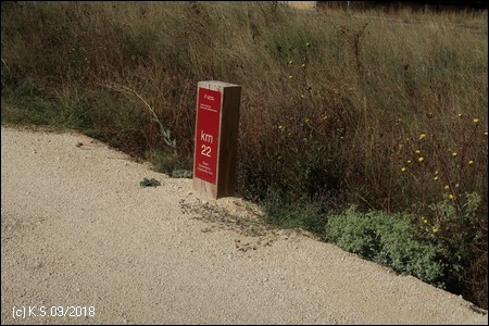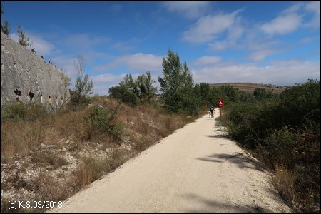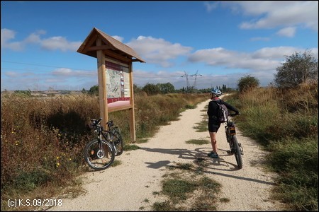 Eine Infotafel und ein Wegweiser, so beginnt der Radweg "La Bureba". Ein holpriger Feldweg, teils zugewachsen, führt auf der Trasse zurück Richtung Burgos, wo die alte Bahnstrecke von Straßen und Industrieanlagen überbaut wurde. Die Vía Verde selbst ist nicht asphaltiert, sondern erhielt eine Decke aus festgewalztem Splitt und Sand, an manchen Stellen auch schon wieder recht lose.