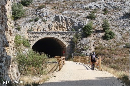 Etwa bei Kilometer 13 des Radwegs beginnt ein felsiger Durchbruch gefolgt von zwei Tunneln: Hier hat sich der Bach "Arroyo de la Hoz" tief in das Gestein eingegraben (Desfiladero de la Hoz).