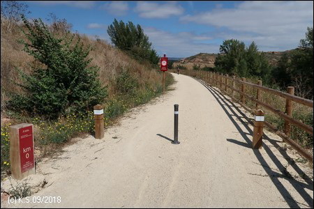 Weniger gut zu finden ist ohne GPS der Ausgangspunkt der Vía Verde, der ca. 9 km nördlich inmitten der Felder beginnt. Wegweiser haben wir vergeblich gesucht. Jenseits der Industriegebiete am nördlichen Stadtrand bei dem kleinen Ort Sotragero beginnt (oder endet) die ausgebaute Strecke - etwa bei Kilometer 22 des Radwegs. Die folgende Beschreibung ist eine Möglichkeit, den Startpunkt mit dem Fahrrad zu erreichen. Um den Burgberg zu umgehen kann man zunächst dem Radweg am Rio Arlanzon flussabwärts folgen (ca. 1,5 km), überquert dann den Fluss an der Avenida de la Universidad. Am nächsten Kreisverkehr (Avenida Oscar Romero) beginnt ein roter Radweg, der am großen Friedhof (Cementerio Municipal San José) vorbei in das Industriegebiet im Norden der Stadt führt.