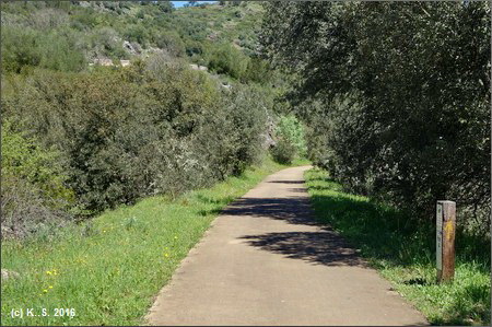 Um zum Beginn der Vía Verde zu gelangen, muss man die Bahnstrecke überqueren. Wegweiser führen zum Beginn des Radwegs am Parkplatz beim Freizeitgelände Isla Margarita. Kilometer Null!