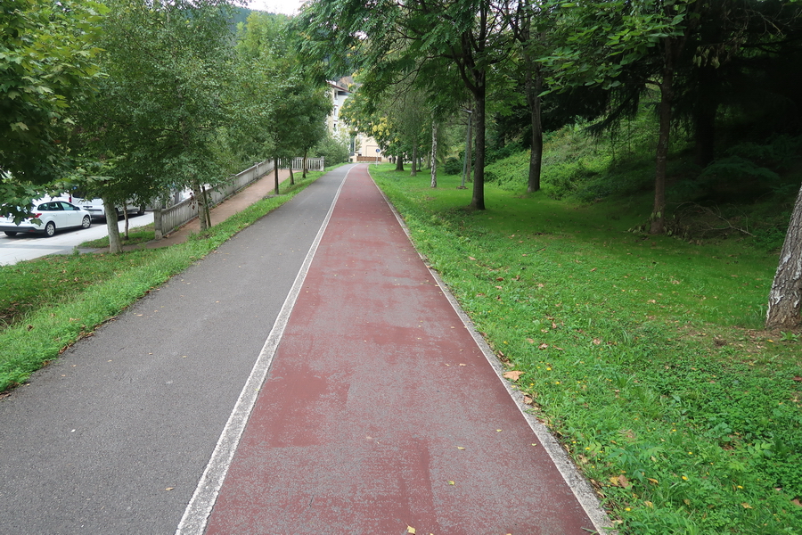 Jenseits der Passhöhe von Arlabán gibt es zunächst keinen Radweg mehr, ein Ausbau hat bisher nicht stattgefunden. Wer weter will muss auf der Straße fahren, empfohlen wird die GI-627. Im September 2024 war diese Strecke wegen Bauarbeiten gesperrt. Wir nahmen die Alternativstrecke über Leintz-Gatzaga. Starkes Gefälle erwarten wir ohnehin, denn die ehemalige, nicht ausgebaute Bahnstrecke soll 14 Brücken und vier Tunnel enthalten. So bleiben 8,7 km auf der Autostraße mit reichlich Verkehr (ggf. hin und zurück.), als Radtour für Familien mit Kindern weniger geeignet. Die offizielle Seite hofft auf baldigen Ausbau der Trasse, seit 2010 hat sich hier aber nicht bewegt, weitere Infos haben wir nicht gefunden.