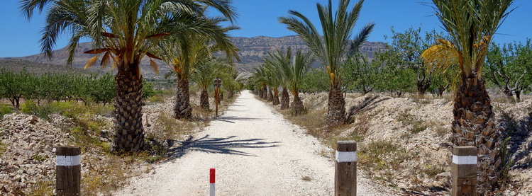 Diese Vía Verde trägt den Namen des Gebirges durch das er führt (Sierra del Maigmo), und sie entstand auf der Basis der nie fertiggestellten Bahnstrecke Alcoi - Alicante. Die Strecke ist bis auf einen ganz kurzen Abschnitt nicht asphaltiert. Startpunkt VomBahnhof Agost 5 km südöstlich des Ortes gelegen (kein Haltebahnhof mehr) auf 22 km in eine Höhe von 660 m zum Parkplatz Puerto del Maigmó direkt neben der Autobahn A7. Die Bauwerke am Radweg umfassen 6 Tunnel und 2 große Viadukte, teils mit Natursteinen schön ausgebaut und restauriert, das Kapital dieses Radwegs aber ist die für uns außergewöhliche Landschaft der "Badlands, die durch Erosion der Lehm und Gipsböden tiefe Furchen und Schluchten enstehen ließ. Schroffe Berghänge und Einschnitte leuchten in allen Farben und begleiten den Radweg. Die karge Vegetation blüht schon bei wenigen Wassertropfen auf, aber die zerfurchten Hänge zeigen, dass es auch heftige Wolkenbrüche gibt. Das Ende des Radwegs ist 14 km von nächsten größeren Ort (Castalla) entfernt.
