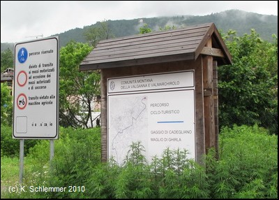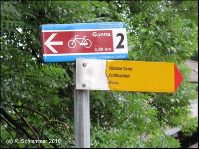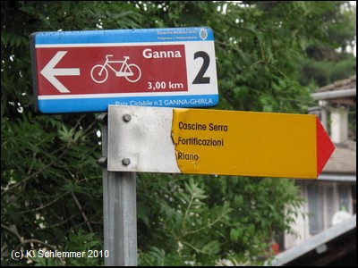 Eine Beschilderung war nicht vorhanden. Man fährt etwa einen Kilometer entlang der Straße, dann führt ein Radwegeschild rechts ab Richtung Gugliate-Fabisasco. Entlang der Straße erreicht man Cunardo. Von dort wäre es ein Leichtes über die Via Raglio Richtung Ghirla zu fahren, der beschilderte Radweg macht aber eine große Schleife um Cunardo und durch die Wiesen und mündet schließlich auf die Via Varesina.