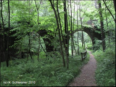 Eine Brücke mit schräg gemauerten Bögen führt über das Tal.