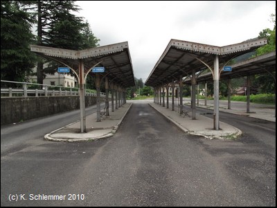 Das Bahnhofsgelände dient als Busbahnhof. Die überdachten Bahnsteige mit ihren Verzierungen sind wohl noch original.