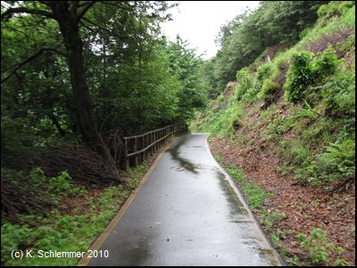 Das Bauwerk verschwindet fast im dschungelartigen Bewuchs. Der Radweg führt weiter bergauf.