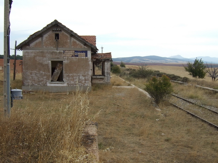 Haltepunkt Torrubia de Soria mit Wartehäuschen, gut bei Regen und zu viel Sonne! Wenig weiter erreicht man Tordesalas bei Kilometer 37des Radwegs. Auch dieser Bahnhof ist nur noch eine Ruine, aber mit einem Rastplatz (ohne Schatten).