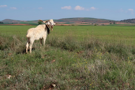An einem Querweg ist der Radweg mit Pfostensperren "gesichert", ein Ziegenbock ist als Wächter eingesetzt.
