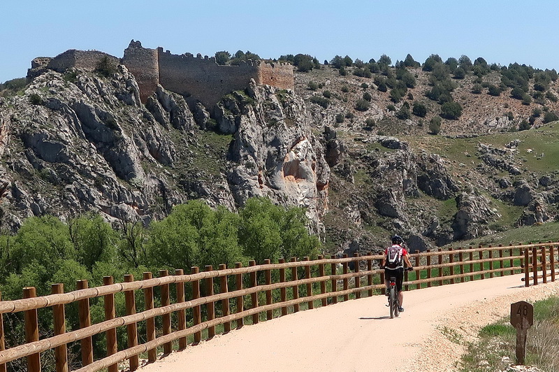 Die stillgelegt Bahnstrecke des Ferrocarril Santander-Mediterráneo verlässt den Bahnhof Soria-Cañuelo (1044 m ü.NN.) durch den rechten Tunnel Richtung Rio Duero. Um den Burgberg herum und über die alte Eisenbrücke geht es hinauf in die Hochebene. Zum Beginn der Vía Verde im heutigen Industriegebiet von Valcorba nahe dem alten Bahnhof (Ruine) musste man 2022 noch auf der Straße fahren, der Anschluss zwischen der Stadt und dem neuen Radweg auf der alten Bahntrasse soll aber demnächst gebaut werden. In etwa 1000 m über dem Meeresspiegel dominieren lange gerade Abschnitte ohne wesentliche Steigungen oder Gefälle. Erst ab dem Bahnhof Portillo de Soria (1024 m ü.NN.) nach etwa 28 Kilometern Fahrt, beginnt ein sanfter Anstieg nach Tordesalas (1066,2 m ü.NN.), dem Scheitelpunkt dieses Abschnitts. Die letzten 6,5 km bis zur Provinzgrenze nach Aragón geht es durch die schroffe Gebirgsbarriere der Sierra de la Vigornia hinab auf 1016 m ü.NN., vorbei an der maurischen Burg Castillo de Ciria, die an der Steilwand gegenüber empor ragt. Durch den 245 m langen, beleuchteten Túnel de Ciria abwärts erreicht man das abrupte Ende des Ausbaus nach 2 km, noch vor der Brücke über den Río Manublas (Prov. Aragón).