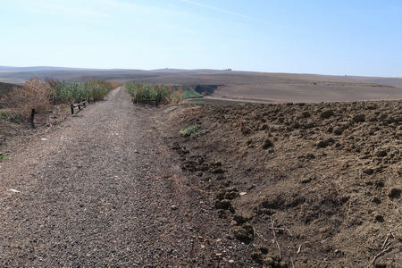 Der Radweg führt weiter geradeaus durch die trockenen, bereits umgepflügten Felder.