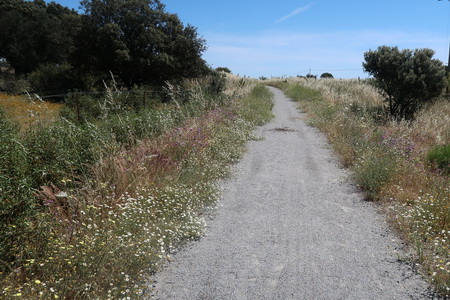 Es folgt ein Damm über den Arroyo del Haza, zur Zeit völlig ausgetrocknet. Die holprige Fahrbahn wird langsam wieder von der Natur erobert.
