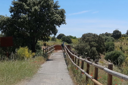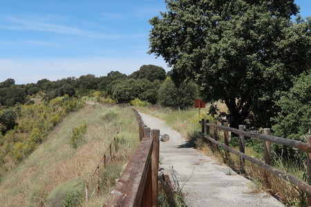 Kurz darauf ist das Ende der Vía Verde erreicht. Die Infotafel ist leer, auch ist kein Wegweiser in Sicht. Man muss vor der Brücke rechts abbiegen, durch einen Weidezaun (bitte Gitter wieder schließen!) und über die Brücke. Von dort aus erreicht man sowohl die Straße zum Fluss Tiétar (Carretera de las Urdimalas), als auch die Landstraße EX-108. Von der Brücke aus erkennt man noch die alte Bahntrasse, die in einem Bogen in die neue Bahnstrecke mündet.