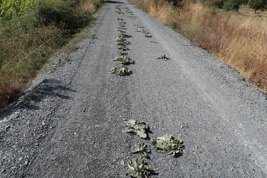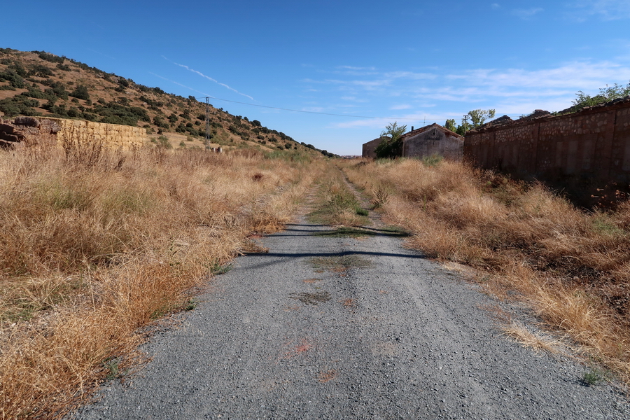 Die Bahntrasse verläuft direkt neben der Landstraße. In Encinas de Arriba, am Bahnübergang, liegen noch Gleisreste, in Sieteiglesias versperrt ein Plasikband den Durchgang.