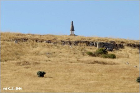Die Tafelberge der Arapiles tauchen am Horizont auf. Hier fand im Jahr 1812 die Schlacht bei Salamanca (La Batalla de los Arapiles) statt (Gedenkstein auf dem Arapil Grande).