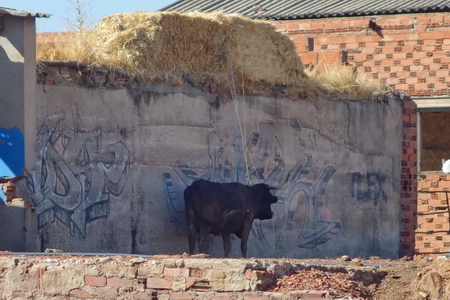 Rastplatz La Dehesa Charra in der prallen Sonne. Selbst der Stier sucht den Schatten.