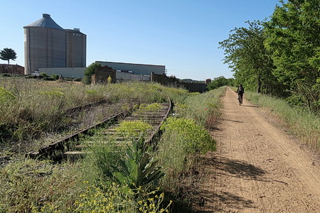 Kilometer 5 des Radwegs. Auf dem Damm auch noch vereinzelt Schienen.