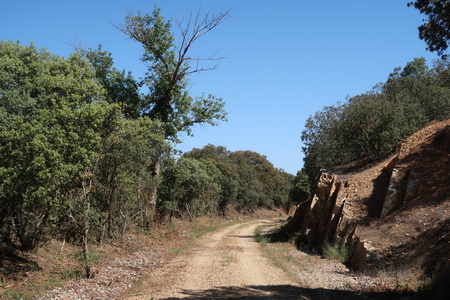 Durch einen Einschnitt in den sandigen Boden. Dann überquert eine Straße den Radweg.