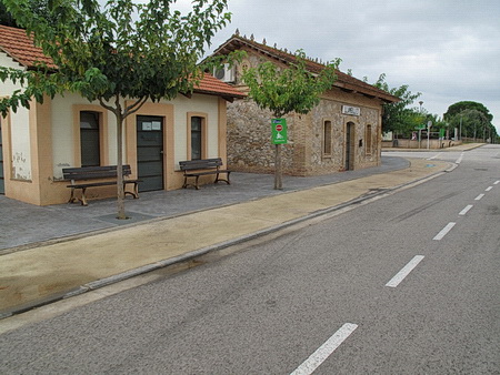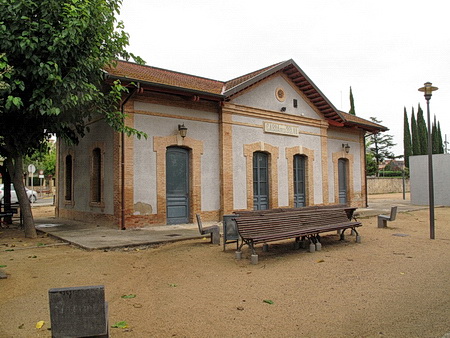 Der Ort Llagostera kommt in Sicht. Auch hier wieder ein restauriertes Bahnhofsgebäude. Dort befindet sich die Touristeninformation.