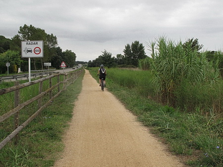 Achtung Radler, Tempo 100! Radarkontrolle. Vor dem Ort Cassa de la Selva führt eine Metallbrücke über den Bach Bugantó.