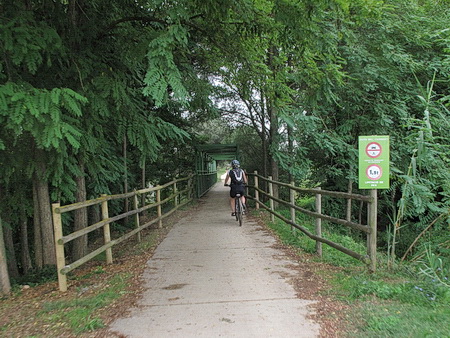 Der Radweg Richtung Quart, links halten! Die Fahrbahn ist (bei Trockenheit) gut zu fahren, aber nicht asphaltiert. Durch den Ausbau der Nationalstraße wurde die Trasse unterbrochen. In einer Schleife geht es unter der Straße durch und auf der restaurierten Bahnbrücke über den Onyar.