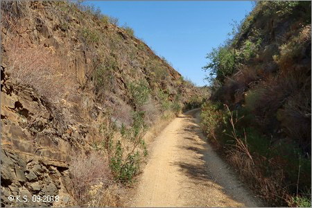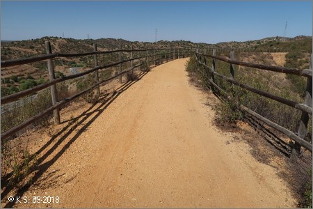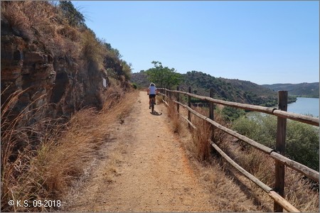 Von den Verladerampen aus folgt man der alten Bahntrasse zu einem Rastplatz am Hang oberhalb des Río Guadiana. Die schmale Trasse wurde aus dem Felshang gehauen, man blickt weit hinab über den Fluss.