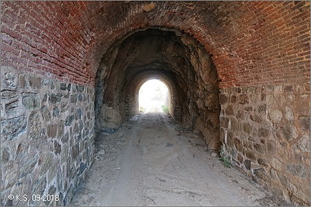 Schon nach einem Kilometer erscheint der erste und einzige Tunnel dieser Strecke. Ein schön gemauertes Portal ziert die Einfahrt in diese kurze, unbeleuchtete Röhre.
