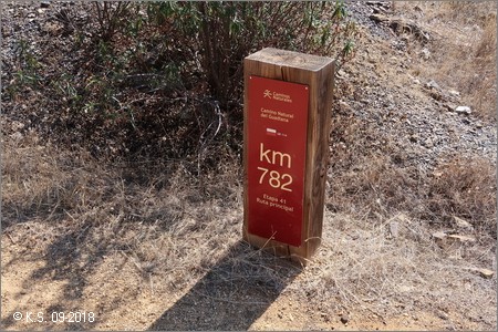 Und weiter in langgezogenen Kurven in die Berge. Ein Wegweiser des Wanderwegs "Camino Natural del Guadiana", Kilometer 782 steht am Wegesrand (GR 114, Hauptroute, Etappe 41. Länge 1004 km von Albacete nach Huelva).