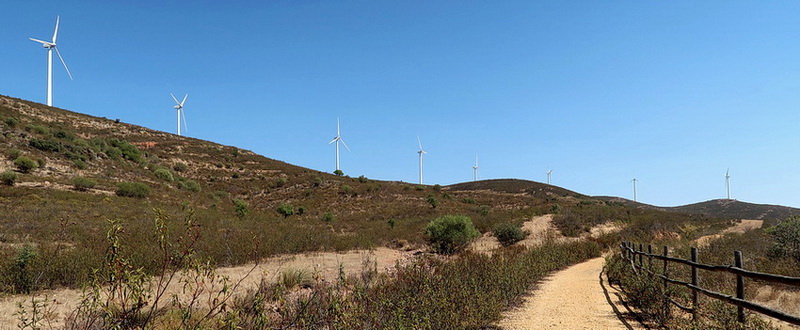 Ganz im Südwesten Spaniens, in der Provinz Huelva (Andalusien), am Río Guadiana, liegt der kleine Ort Puerto de La Laja. Der Fluss bildet die Grenze zu Portugal und besaß einen kleinen Binnenhafen, von dem aus das Erz aus den zahlreichen Minen der Region abtransportiert werden konnte. Eine Schmalspurbahn verband die Verladestationen mit den Minen von Las Herrerías. Die Bahnstrecke war von 1888 bis 1965 in Betrieb. Von der ehemals 32 km langen Strecke (76,2 cm) sind heute knapp 17 km befahrbar. Von Puerto de La Laja führt der Radweg zunächst am Felshang entlang in einer kurvigen Strecke und durch einen kurzen Tunnel mit etwa 2-2,5 % Steigung hinauf zum ehemaligen Bahnhof El Sardón. Hierbei überquert man den Bewässerungskanal "Canal de Boca Chanza", der aus dem Stausee des Río Chanza, einem Nebenfluss des Río Guadiana abgeleitet wird. Durch eine einsame und dünn besiedelte Berglandschaft folgt man der alten Bahnstrecke hinauf in die Berge, vorbei an den Windkraftanlagen von El Sardón und überwindet bis zum alten Bahnhof (Ruine, Rastplatz) einen Höhenunterschied von ca. 200 m. Nach dem Bahnhof (Kilometer 10,8) geht es leicht bergab, und man erreicht nach weiteren 6 km den kleinen Minenort "Poblado Minero La Isabel". Dort endet unvermittelt der Ausbau auf der Bahntrasse.