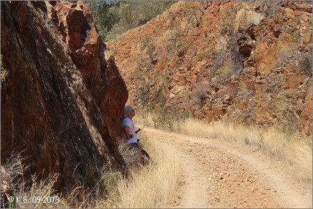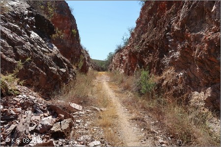 Nun geht es leicht bergab. Aber Vorsicht, die ruppige Piste hat einige Stolperfallen zu bieten, auch mitten auf der Fahrbahn! Erneut geht es durch einen tiefen Einschnitt.