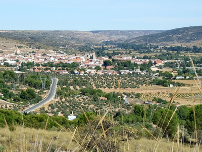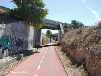 Ein kurzes Stück der ehemaligen Trasse muss umfahren werden, in großen Schleifen geht es bergab. Die alte Trasse führt geradeaus weiter. Unten im Tal, liegt der Ort Morata de Tajuña.
