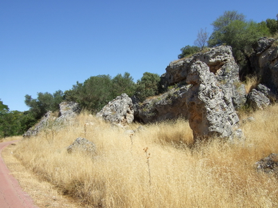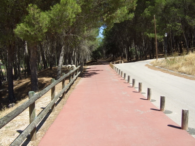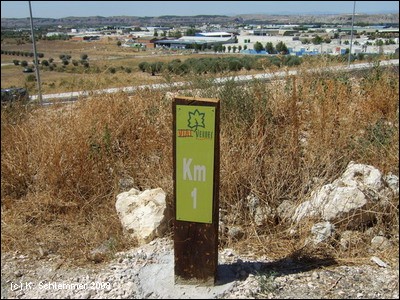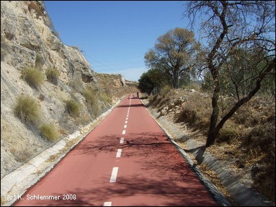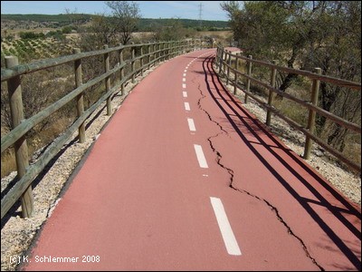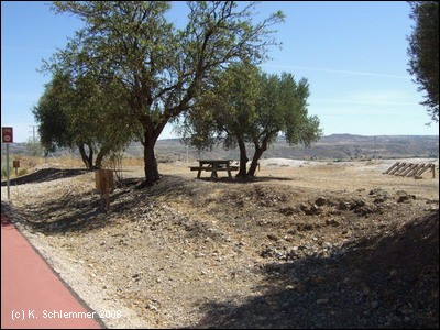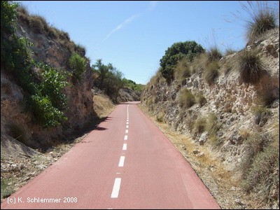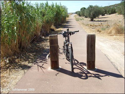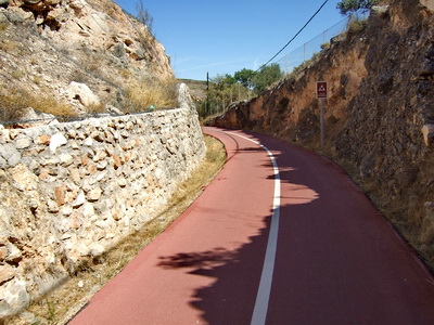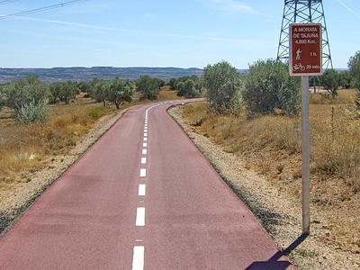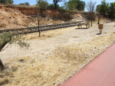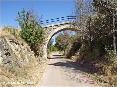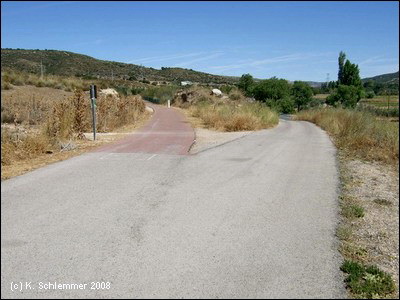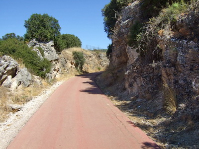 Einen Kilometer außerhalb des Ortes , etwa bei km 17 des Radwegs, zweigt die Via Verde wieder von der Straße nach links ab auf die Trasse. Die Doppelsperren stehen unangenehm eng, man muss aufpassen, dass man nicht mit dem Lenker hängen bleibt. Vorsicht auch in diesem Abschnitt, manchmal benutzen Traktoren die Strecke zur Bearbeitung der Olivenplantagen.