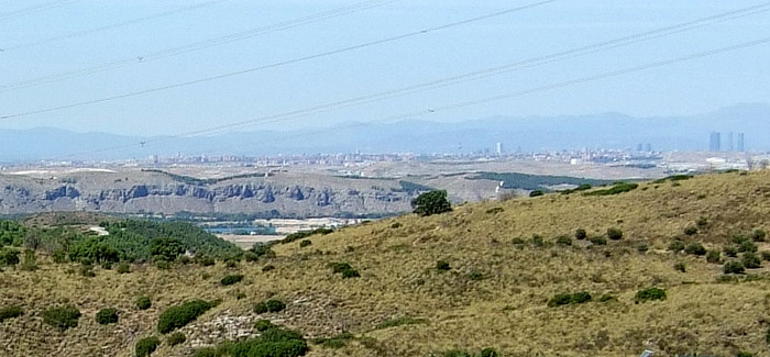 Am Horizont erscheint die Silhuette von Madrid und dahinter die Berge der Sierra de Guadarrama.