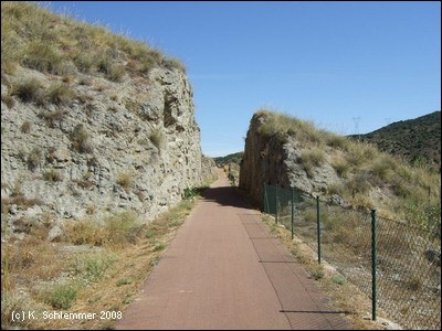 Man erreicht einen Rastplatz noch vor dem Gipfel des Radwegeabschnitts. Ein alter Schienenstrang wurde belassen, zur Erinnerung an die Bahnstrecke. Noch durch einen felsigen Einschnitt, dann wird der Blick frei.