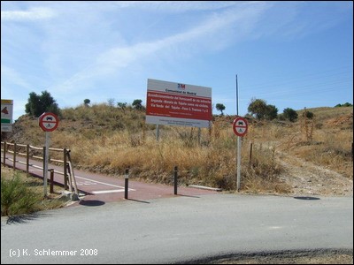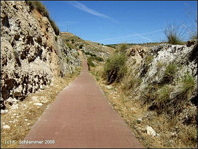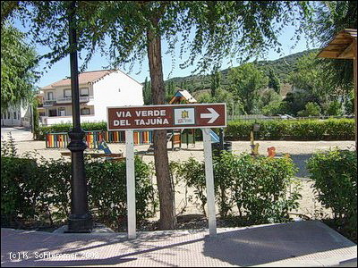 Final de la Via Verde - Ende des Ausbaus! Die Bahntrasse zieht weiter durch die Berge. Als Vía Verde del Tajuña II ist die Trasse wohl befahrbar, aber nicht ausgebaut . Sie hat Feldwegcharakter und ist vielleicht eher ein Wanderweg. Über Mondéjar nach Yebra sind es 21 km.
