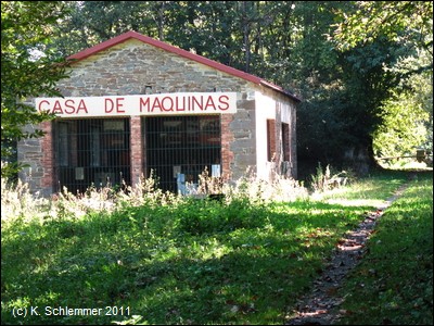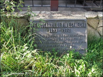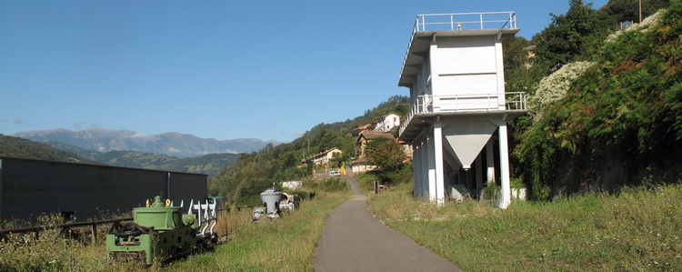 Von der Grube aus jenseits der Straße, geht es eine steile Rampe hinauf auf eine alte Bahntrasse. Das alte Maschinenhaus, das als Werkstatt für die Lokomotiven diente, ist heute Ausstellungsraum (leider bei unserem Besuch 2011 verschlossen). Kurz hinter dem Gebäude erreicht man die erste der kuriosen Eisenbrücken, auf denen die Seitentäler überquert wurden. Hier ist ein Abschnitt der alten Minenbahn erreicht, der über Brücken und durch Tunnel der alten Bahnstrecke durch die "Cuencas Mineras" und die üppige grüne Landschaft Asturiens führt.