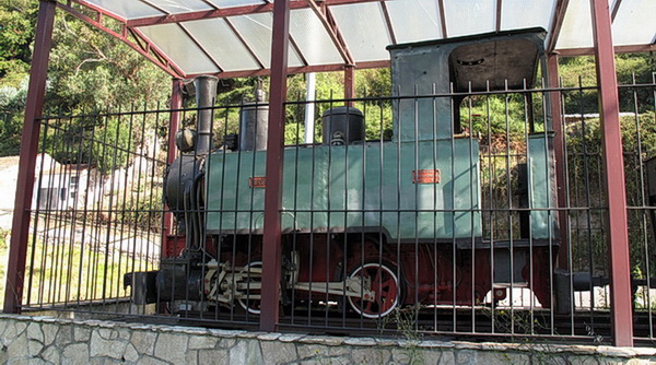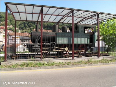 Am Ortseingang steht eine alte Lokomotive. Der Tafel ist zu entnehmen, dass die Schmalspurbahn von 1893 bis 1972 in Betrieb war.